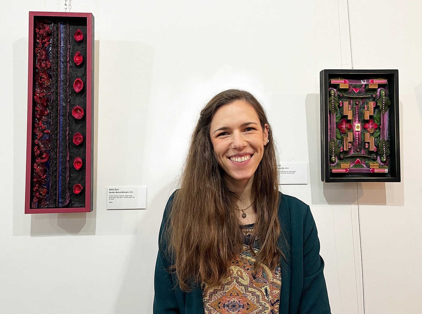 In 2024, she began making fine art that is composed of 75-95% recycled and repurposed material. From deteriorating books and discarded paper, she makes recycled-paper clay. With the clay, she sculpts surreal landscapes and zones of meditation. Plastic waste and repurposed items are then thoughtfully arranged and embedded into the clay, making intricately jeweled one-of-a-kind pieces.